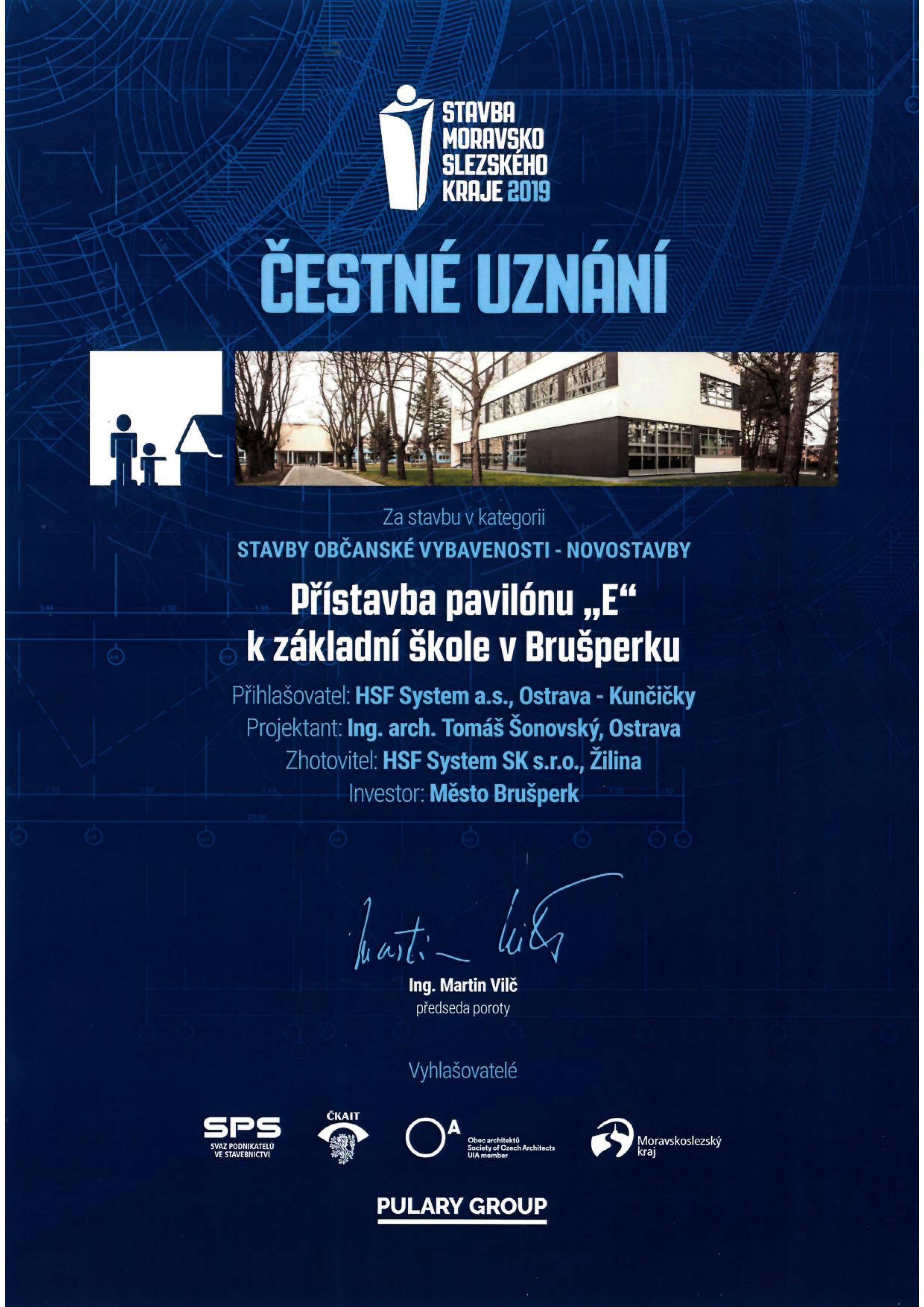 Přístavba pavilónu E školy získala ve 14. ročníku soutěže Stavba Moravskoslezského kraje Čestné uznání v kategorii Stavby občanské vybavenosti - novostavby. Více informací zde.