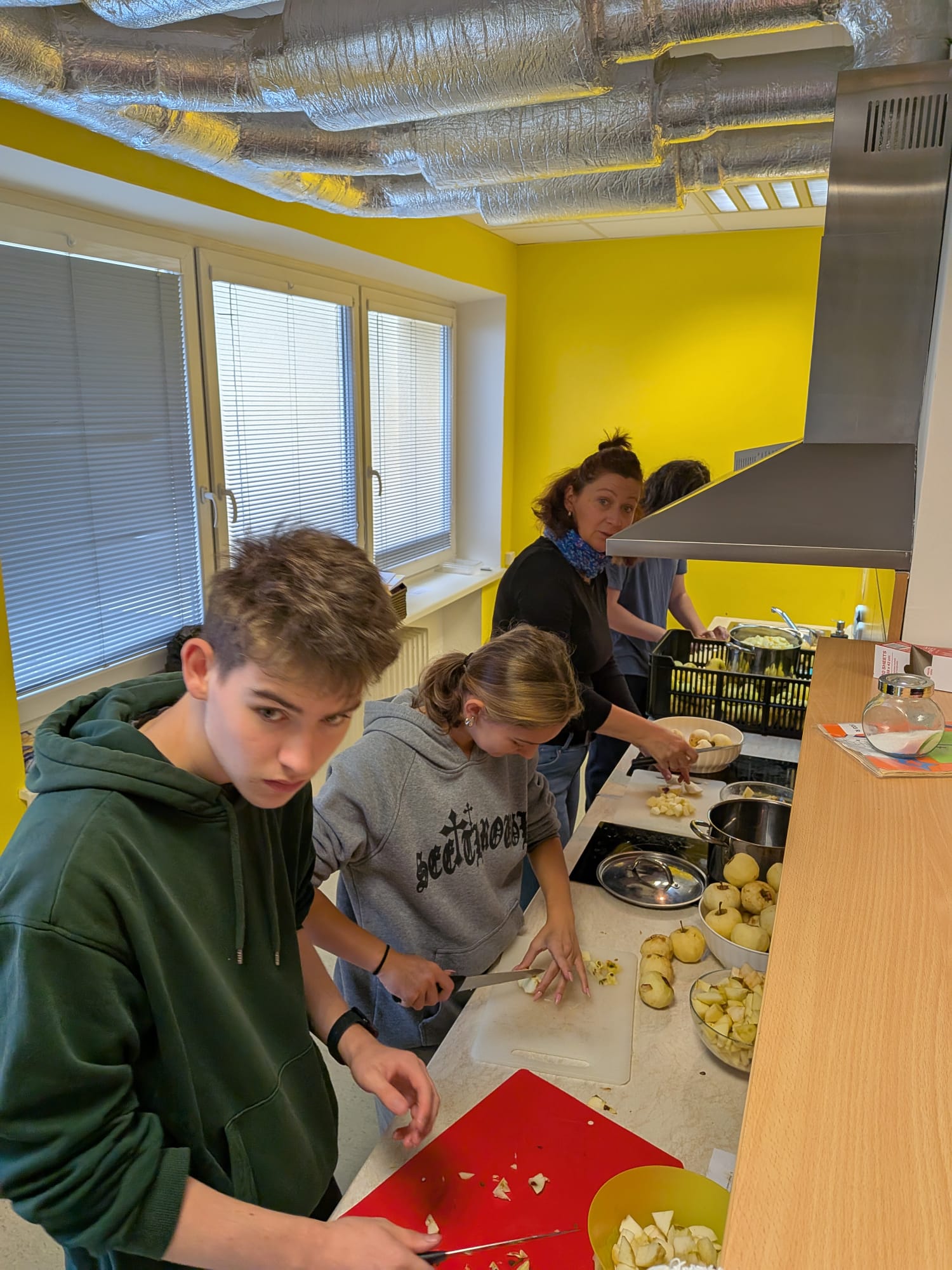 Hned na začátku sobotního dopoledne se dobrovolníci z jednotlivých tříd s chutí pustili do soutěže o nejdelší jablečnou slupku. Chladné ráno, zkřehlé ruce, soustředěnost a napětí – tak by se dala charakterizovat atmosféra soutěže, která nakonec přinesla svého vítěze: Patricii Havlovou z 8. C s délkou slupky 144 cm.